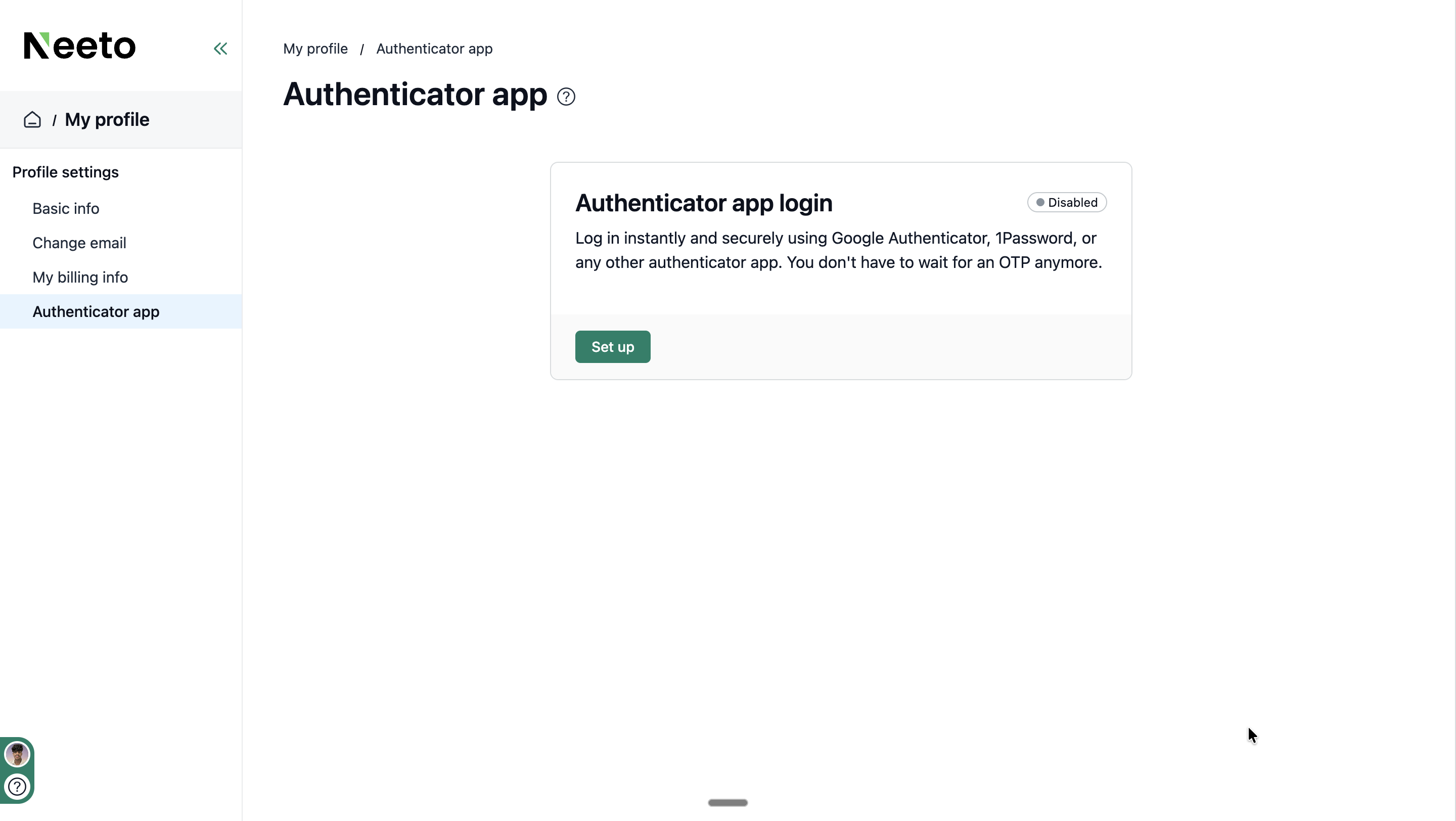 Log in to your account and navigate to My profile → Authenticator app. Click on Setup.