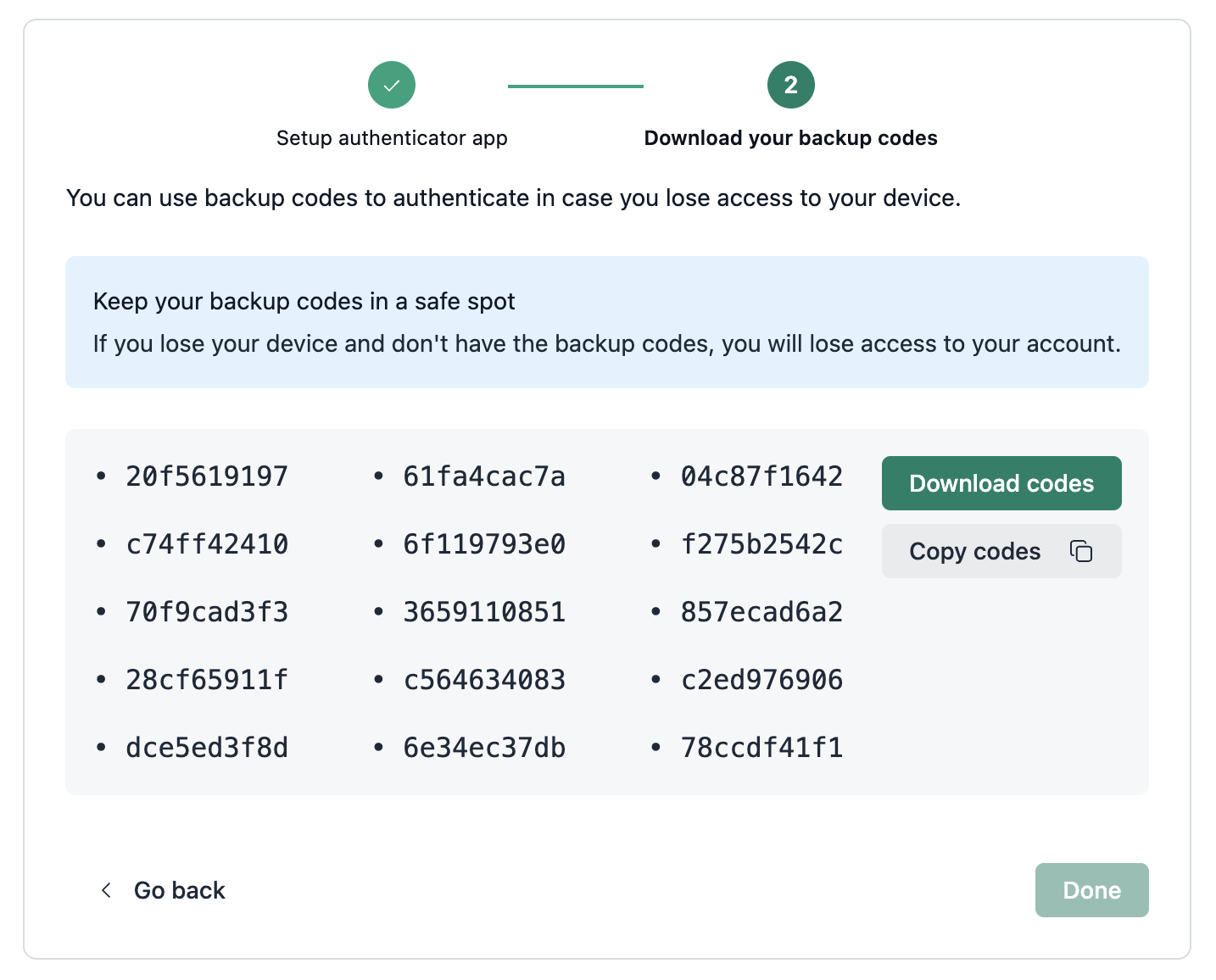 After verifying your code, you'll see a set of 15 backup codes. These are emergency codes you can use to sign in if you ever lose access to your authenticator app.