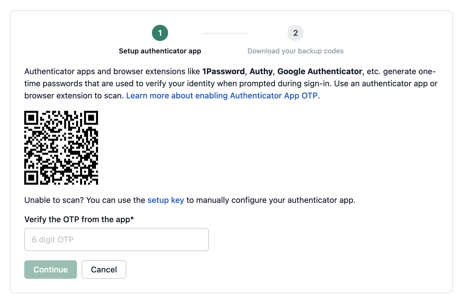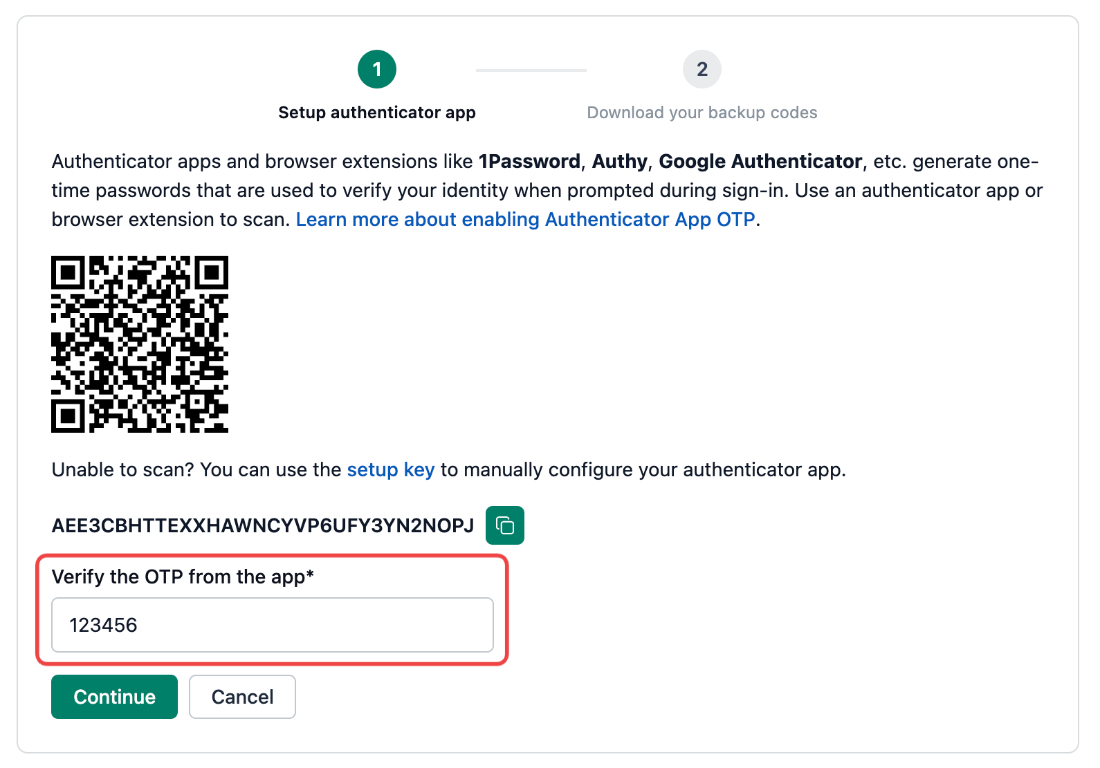Type this 6-digit OTP into the "Verify the OTP from the app" field and click Continue.